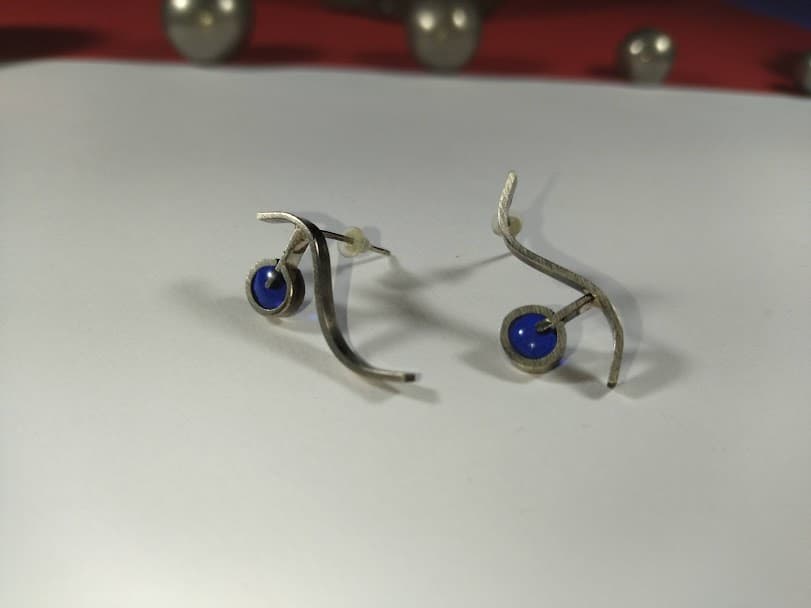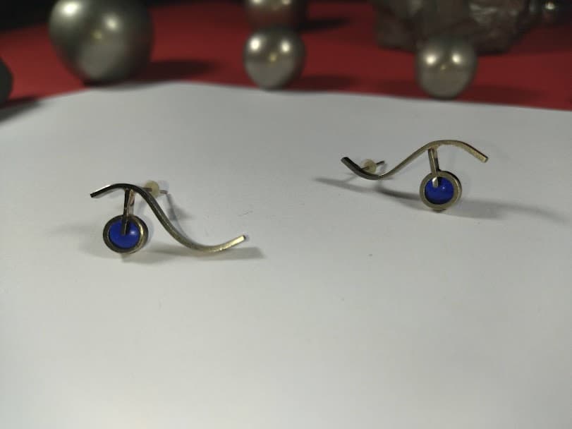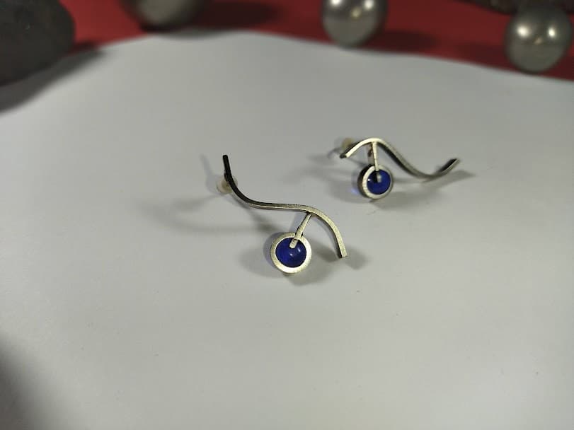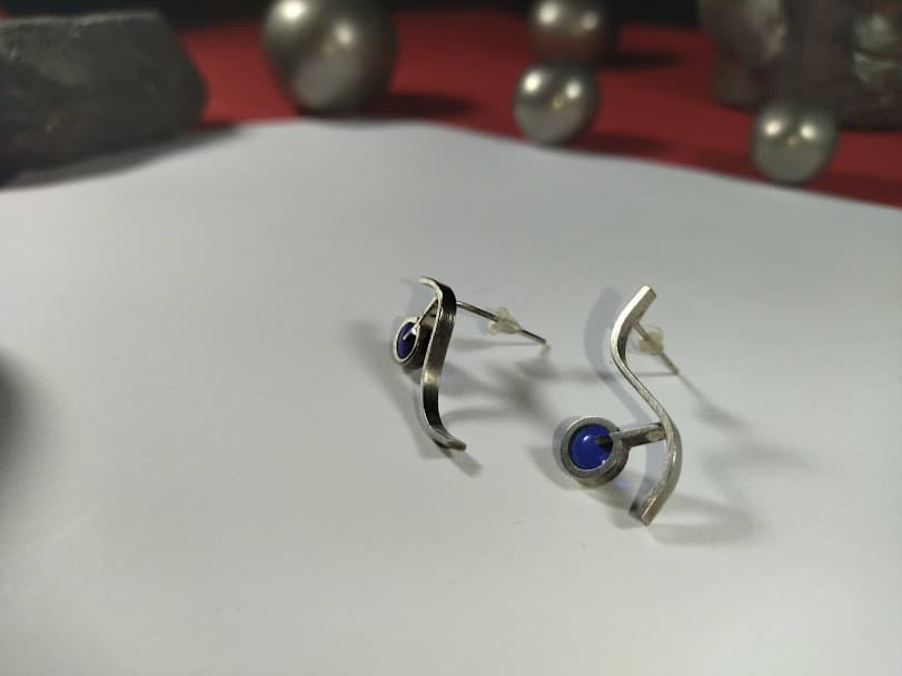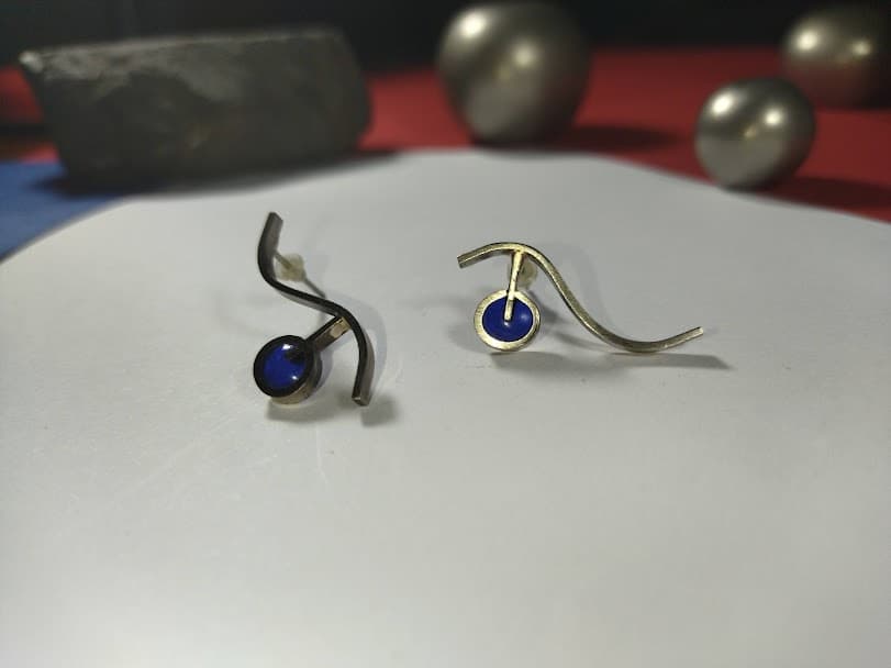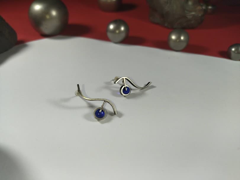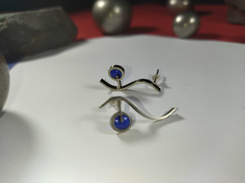 Su diseño asimétrico y orgánico presenta formas esculturales de alpaca que enmarcan delicadamente un cabujón de resina epoxi de un vibrante color azul, evocando la tranquilidad del océano o la inmensidad del cielo nocturno. Cada caravana es una pequeña escultura que captura la luz y el movimiento, ofreciendo un toque distintivo y sofisticado a cualquier atuendo.
