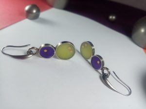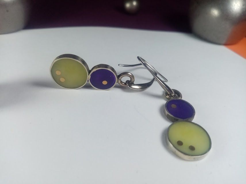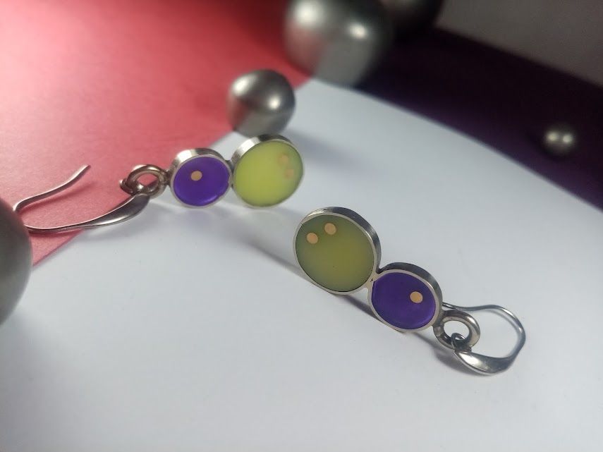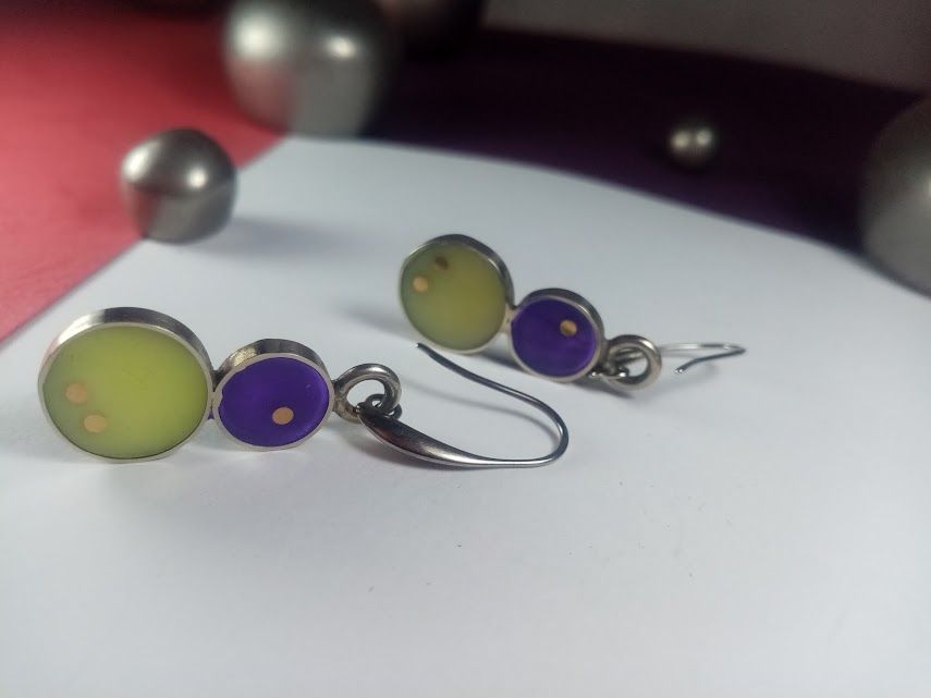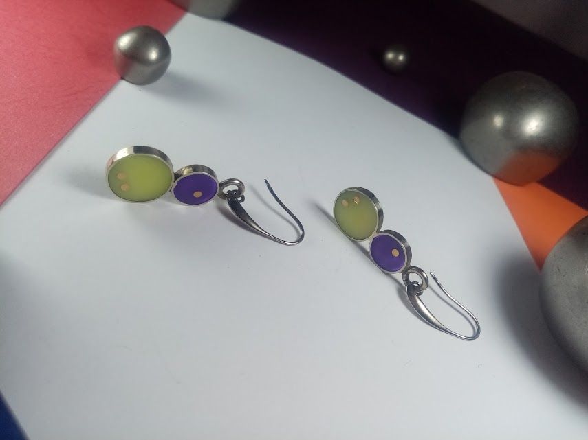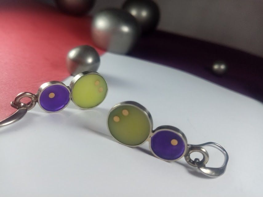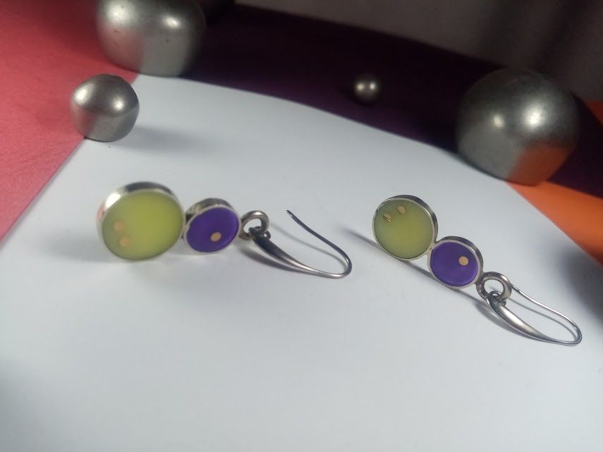 Cada caravana es una pieza de diseño de autora, meticulosamente elaborada a mano en alpaca de alta calidad. Presentan una combinación cautivadora de dos círculos de resina: uno más grande en un tono verde lima suave y otro más pequeño en un vibrante púrpura. La sutil incrustación de pequeños puntos de cobre, en la resina verde añade un detalle único. Son ideales para quienes buscan un accesorio moderno y elegante que combine delicadeza con un toque de color distintivo.