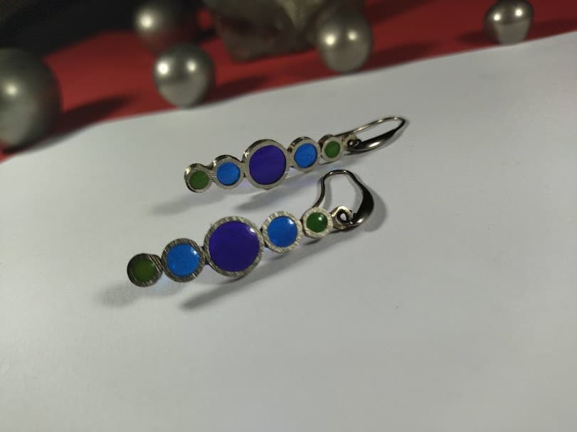El diseño se realza con un complemento de resina epoxi de alta calidad, creando vibrantes óvalos en tonalidades de azul profundo y verde esmeralda. La combinación de estos colores evoca una sensación de sofisticación y frescura, perfecta para complementar cualquier atuendo, desde lo casual hasta lo más formal.