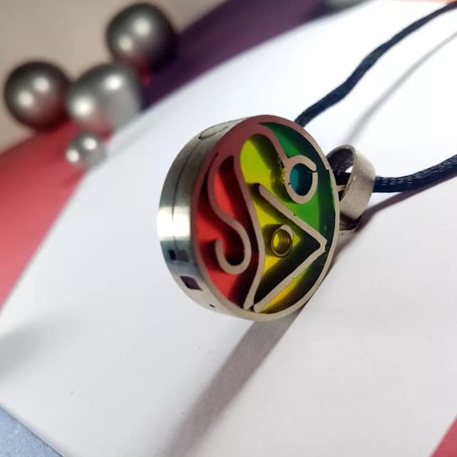 Descubre la fusión de arte y significado en este colgante. Cada pieza es una creación artesanal, meticulosamente elaborada en alpaca de alta calidad y realzada con vibrantes incrustaciones de resina en tonos rojo, amarillo y verde. El diseño central, con sus formas entrelazadas, evoca equilibrio y conexión, mientras que la cuerda ajustable asegura una adaptación perfecta a cualquier estilo y escote. Ideal para quienes buscan una joya con personalidad y un toque de color que ilumine su día.