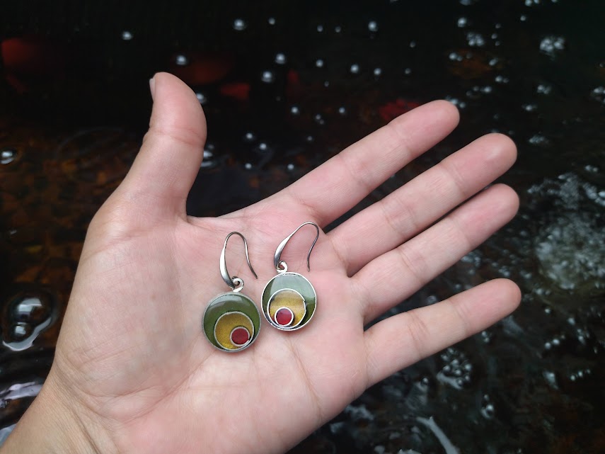 Aportá un toque de color y originalidad a tu rostro con estas caravanas hechas totalmente a mano. Con un diseño de círculos concéntricos en capas de resina epoxi, estas piezas logran un equilibrio perfecto entre lo moderno y lo artesanal.